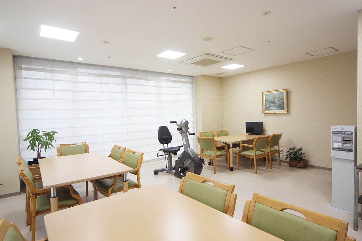 テレビはカード式になっております。カード販売機は2階談話室に設置してありますのでご購入ください。(テレビカード 1枚1,000円) イヤホンは1階受付にて販売しております(イヤホン 1個200円) テレビカードの払い戻しは受付にお申し出ください。 |