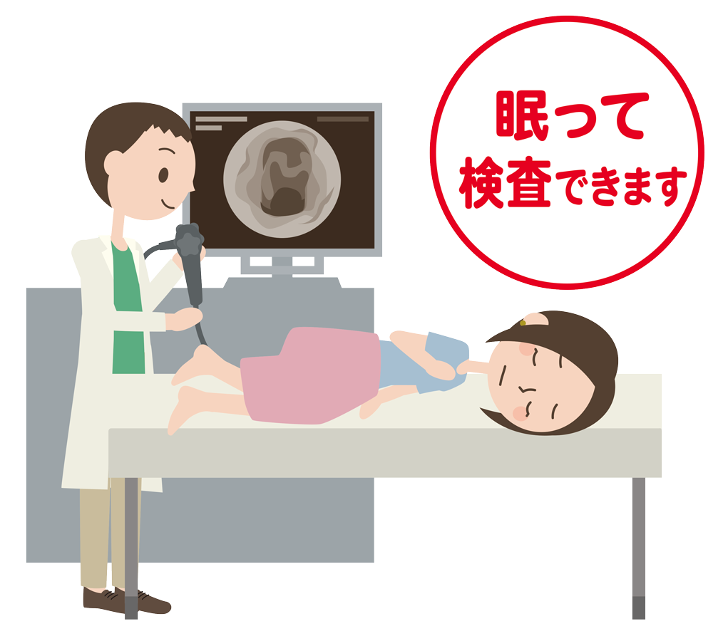 当院では基本鎮静剤を使用し内視鏡検査を行います。上部消化管内視鏡検査ではのどを麻酔することによって反射をおさえて苦痛をやわらげます。しかし、それでも患者様によっては苦痛を感じることがあります。また、大腸内視鏡検査では内視鏡を挿入する際に大腸を伸ばしたり、大腸を膨らませ観察しようと空気を入れることでとお腹がはったり、痛みを生じます。このような場合に鎮静薬などを注射することにより意識を低下させて緊張をやわらげ、苦痛を軽減します。多くは呼びかけに反応する程度の量を注射して検査を行います。血圧の低下や、呼吸が弱くなることがありますので、検査中と検査後も意識がはっきりするまではモニターをつけて監視します。検査が終了しても薬が効いているためしばらく休んでいただきます。