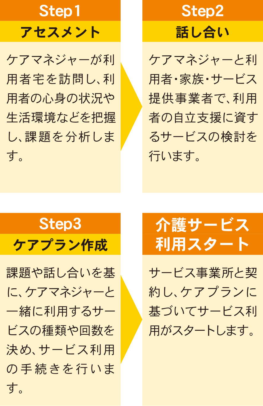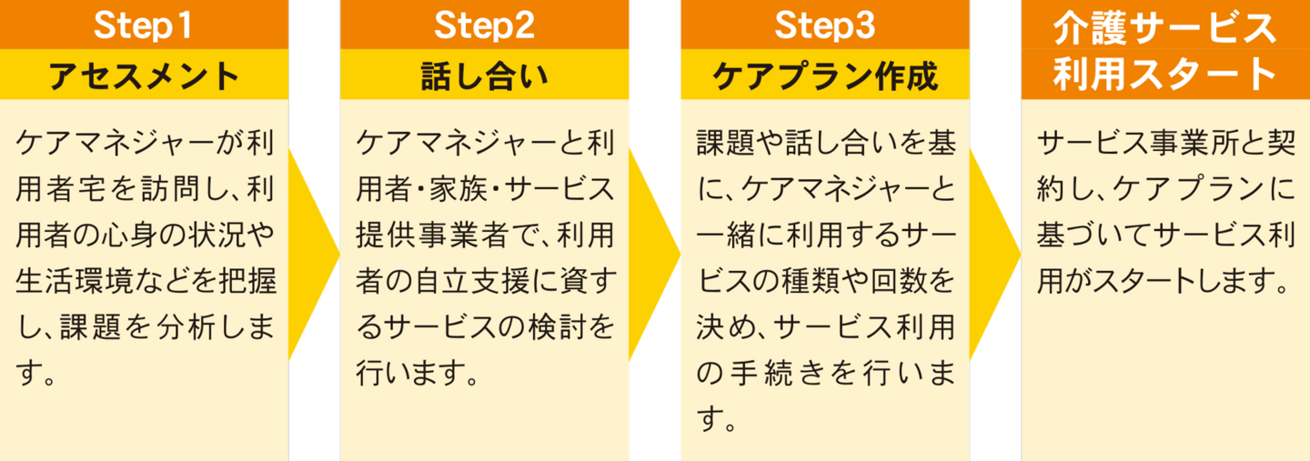 居宅介護支援は、利用者が可能な限り自宅で自立した日常生活を送ることができるよう、ケアマネジャーが、利用者の心身の状況や置かれている環境に応じた介護サービスを利用するためのケアプランを作成し、そのプランに基づいて適切なサービスが提供されるよう、事業者や関係機関との連絡・調整を行います。